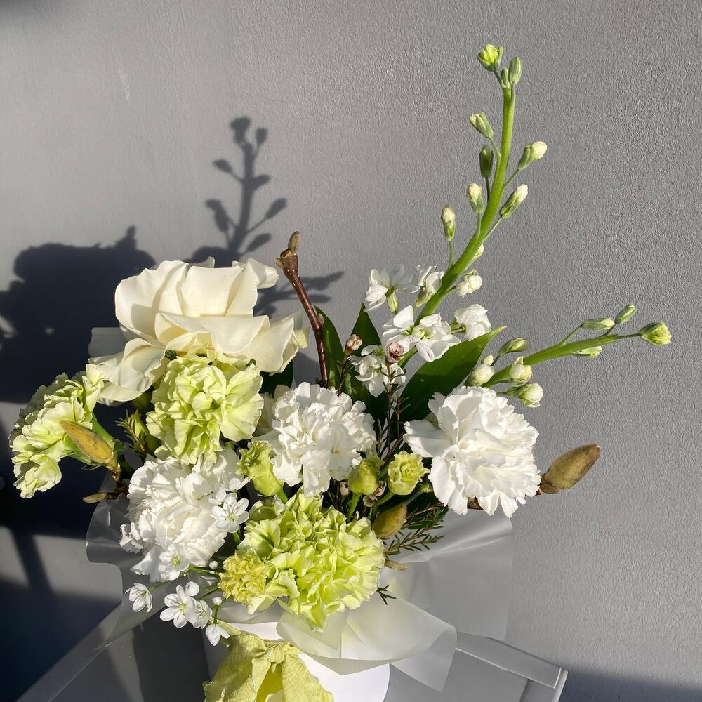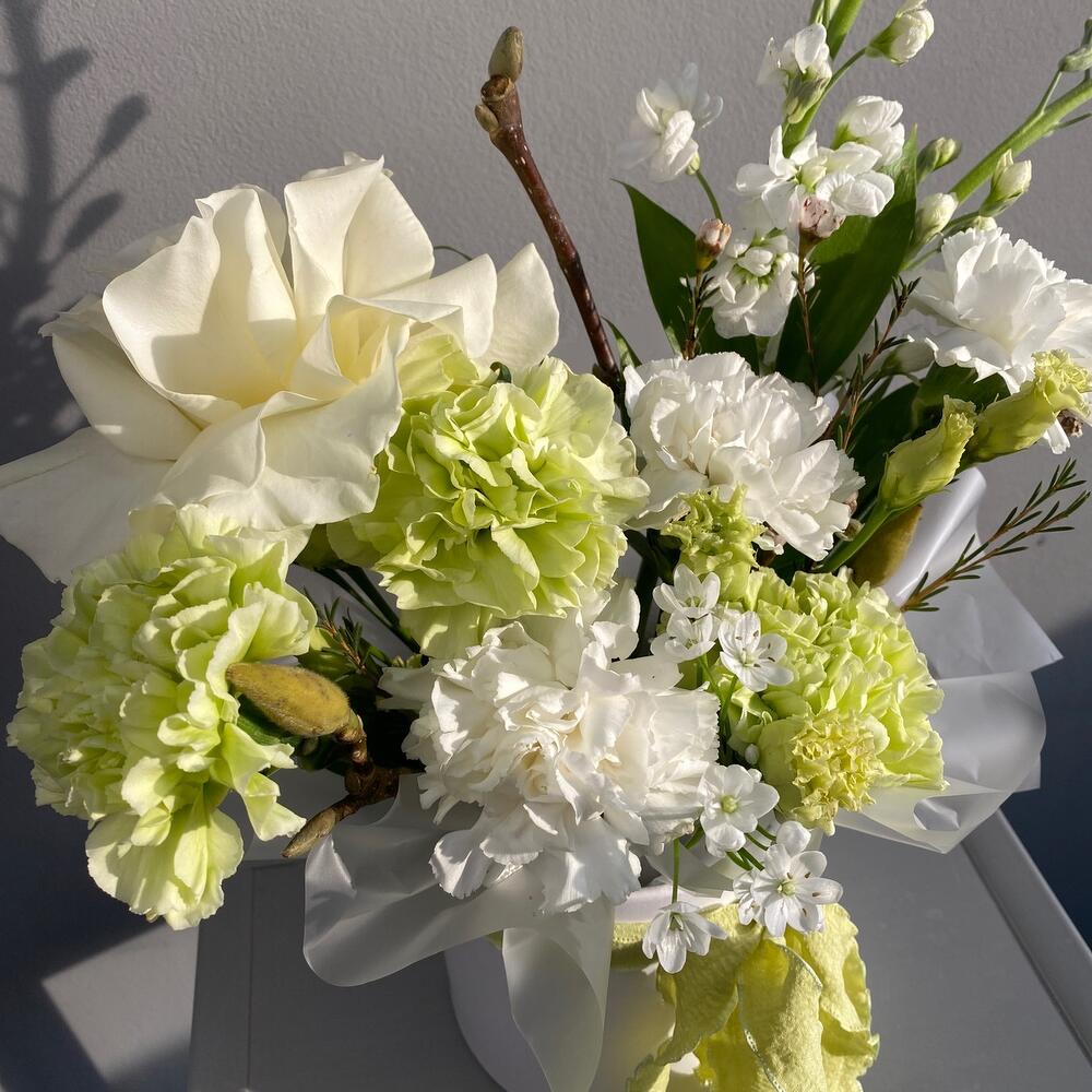 Лента - 1 шт. Магнолия - 2 шт. Маттиола - 2 шт. Рускус - 2 шт. Эустома - 1 шт. Диантус - 7 шт. Шляпная коробка - 1 шт. Хамелациум - 2 шт. Аллиум - 1 шт. Роза Мондиаль - 1 шт.